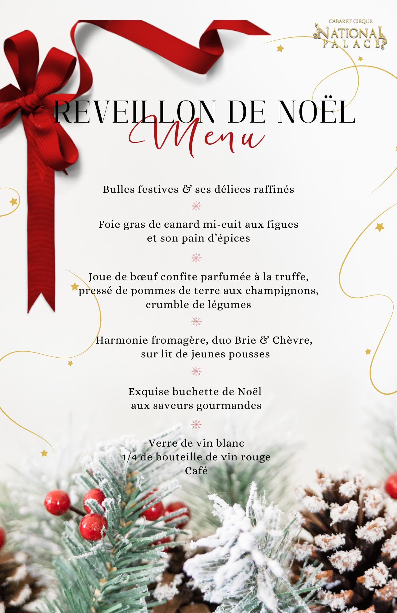 Dans le cadre féérique et l'atmosphère festive du National Palace, savourez un dîner signature alliant créativité et raffinement.